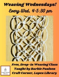 Every Wednesday afternoon, join teacher Barbie Paulsen for a free, drop-in weaving class in the Craft Corner. Barbie has taught weaving for over 23 years, and brings a wealth of experience and expertise to this fascinating craft. Learn how to weave functional items, use a table loom, do macrame, and much more! All supplies and materials provided.