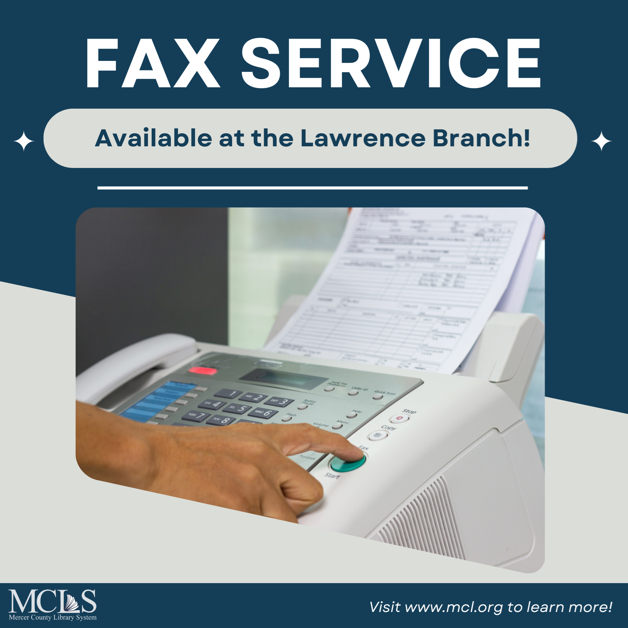 Fax Service AvailableA Fax Service is now available at the Lawrence Headquarters Branch. Faxes may be sent to domestic numbers only. Faxes may only be sent, not received. Payment by cash only. $1.00 first page, $0.50 cents for each additional page. Fax service is available up until 30 minutes before closing. Learn more here.