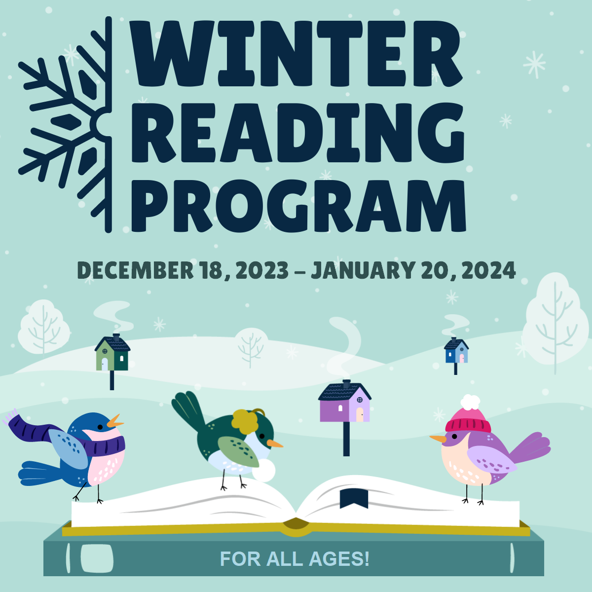Winter Reading ProgramMonday, December 18 to Saturday, January 20Get rewarded for reading this winter—join our Winter Reading Program! Keep track of what you read between December 18, 2023 and January 20, 2024. Return your log to the library to be entered in our Winter Reading raffle. One prize will be awarded to children from each branch in the following age groups: PreK-2, grades 3-5; and grades 6-12. Visit the reference desk for more details. The Winter Reading Program is for all ages – so we encourage the whole family to get involved! Registration is required.
