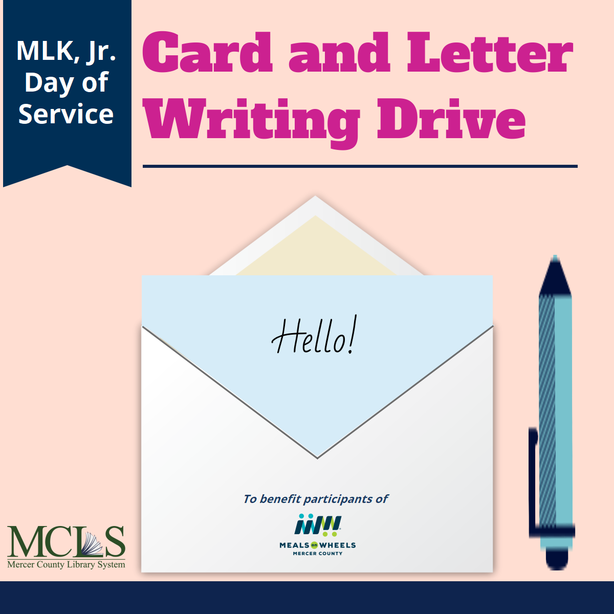 MLK, JR. Day of Service: Card & Letter Writing Drive The Martin Luther King, Jr. holiday is a national day of service celebrating the civil rights leader’s life and legacy. Throughout the month, all branches of MCLS are offering opportunities for community members to write letters or make handmade cards to be delivered to homebound participants of the Mercer County Meals on Wheels program. MCLS invites community members of all ages to take a moment to create a letter or greeting card, to make someone's day a little more special. Participate anytime between January 15th and February 4th. Make sure to visit our Events Page to see a list of MLK, Jr. Day events at MCLS!