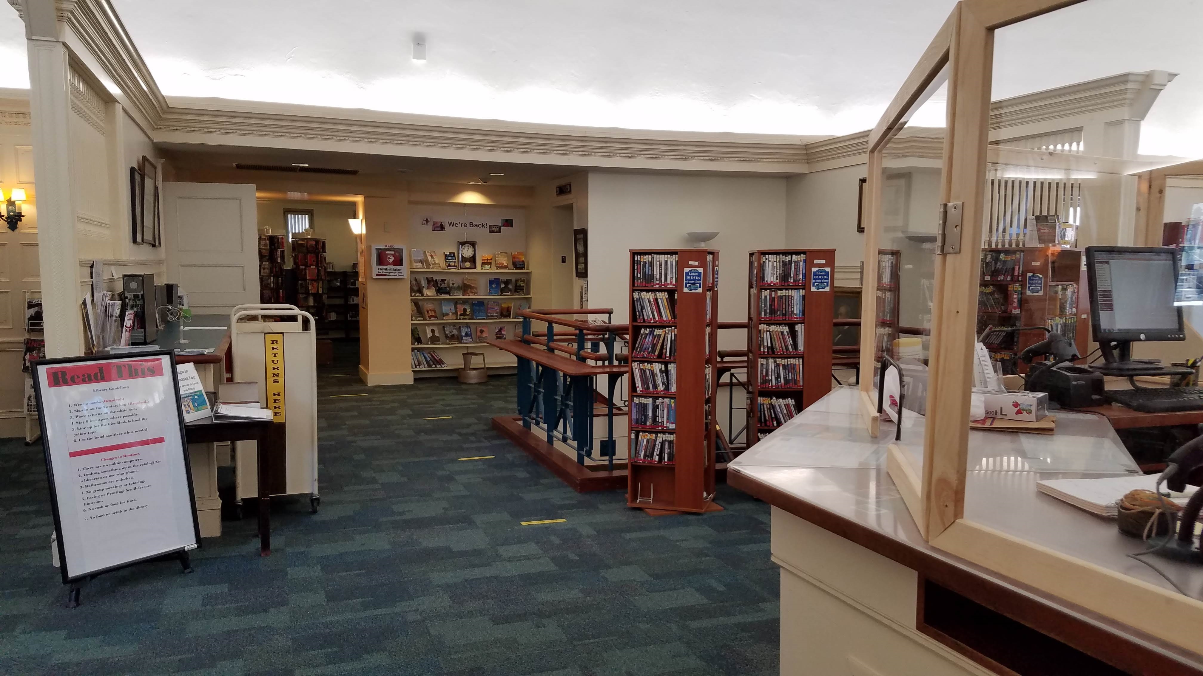 You will first notice the plexiglass partitions covering the Circulation Desk, the Reference Desk and the Librarian's Desk in the Children's room and everyone wearing masks! Then you will see that the public computers (for internet and catalog searching) are gone. Once we get the partitions for these areas we will again be able to let people use the computers.