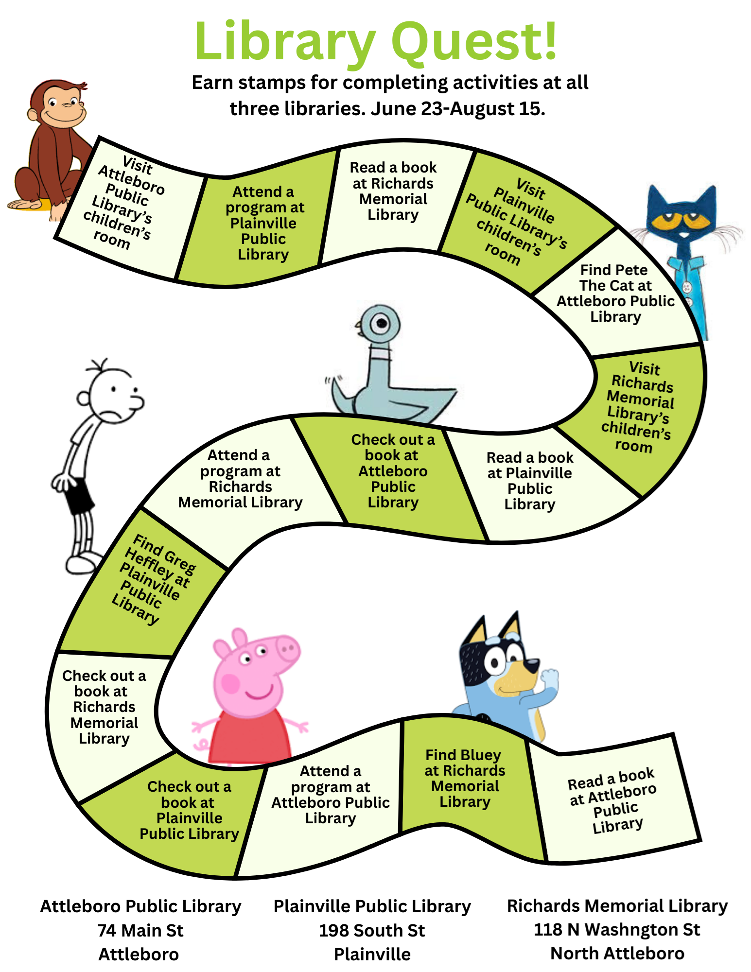 Register your child ages three through entering ninth grade for our Summer Reading program. They will earn a lanyard and buttons as they progress through a reading log. Upon finishing their log, children will receive a free book and a raffle ticket for a fun prize. Prizes this year include passes to places like Launch and Showcase Cinemas and gift cards to Dairy Queen and Unlikely Story. Find the full list of our donors and more information on our website. Summer reading registration ends July 31. July is full of fun programs to keep your children busy. Here are some highlights: On July 9 at 10am, bring your beach towel for a beach-themed indoor story time for ages 0-7. Come dressed in your best costume for our Halloween in July party on July 10 at 11am. We will read stories, color, do a scavenger hunt, and end with a parade through the library. Meet furry and scaly new friends when Animal Adventures returns to the library for an animal show* on July 17 at 11am. Learn to care for animals at our stuffed animal veterinary clinic* and story time on July 23 at 11am for children ages 4-8. The always-popular Life-Sized Candy Land* will be offered on three dates for children ages 3 plus and their families. *Registration required. See our website for a full calendar of events. It's not too late to participate in the a tri-town Library Quest! Ask us for a game sheet and then complete tasks at our library and the Attleboro and Plainville libraries, collecting stamps along the way.