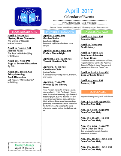 Greetings! I’d like to introduce myself, Judy McKenna, President of the Friends of Ida Rupp Public Library. I’ve asked the Director if we could have a small paragraph in the Newsletter each month and it was welcomed. Mark your calendars for the Annual Book Sale – it will kick off on Wednesday, August 2, 2017 for the Friends from 5:00pm – 7:00pm, as always memberships will be available for purchase at the door. The sale will be open to the public on Thursday, August 3, 2017 from 9:30am – 5:00pm and will wrap up on Friday, August 4, 2017 from 9:30am – 12:00pm. Stay tuned for more news on the Book Sale and Friends activities. Thank you for your continued support!