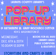 Pop-Up Library @ KWG Resource Center Wednesday, Dec.6th & 20th @ 10:30 am - 12:30pm 404 S. Washington St. Drop by to check out books, request a library card, or use public computers. ⭐Storytime and crafts⭐ @11:00am