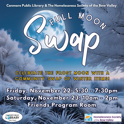 The Canmore Library and the Homelessness Society of the Bow Valley have come together to celebrate the Frost Moon with a community swap of winter items! The November full moon is also known as the Frost Moon due to the tendency for frosty weather this time of year. In the spirit of the Frost Moon, let's get cold-weather ready at our November Full Moon Swap! A community swap of all things wintry could include winter gear like jackets, sweaters, snow pants, gloves, mittens, hats, scarves, wool socks, and boots. Perhaps you have snow sport gear you no longer need like skates, skis, sleds etc. Other winter items could include mugs for hot cocoa, car scrapers, shovels, heaters, and more! The swap will take place in the Friends of the Library Program Room at the CPL. Full Moon Swap - November Frost Moon Friday, November 22: 5:30 - 7:30pm Saturday, November 23: 10:00am - 2:00pm Friends Program Room WE WANT YOUR FEEDBACK! We are dedicated to enhancing our swap events and would love to hear your thoughts. Whether you've attended our monthly Full Moon Swaps or the bi-annual Clothing Swap-O-Ramas, or if you haven't yet participated, your feedback is vital. To help us shape future swaps, please complete the survey found here. Thank you to the Homelessness Society of the Bow Valley for their continued support in running the swaps!