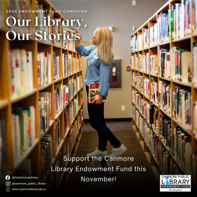 With the theme “Our Library, Our Stories”, this year’s Endowment Fund campaign runs from November 1 to December 10! We are pleased to have four people representing the library as “champions” for this campaign: Anne Baker, Willy Fung, Deserae Komar, and Sally Scherer. All of these individuals have a close relationship with our library: Anne is a former president of the Library Board; Willy currently serves on the Library Board; Deserae is a former CPL staff member and is now the librarian at Canmore Community High School; and Sally is the long-time treasurer of Friends. They have all shared personal stories about how the Library has influenced and enriched their lives. Please join our Library Champions in their support of the Canmore Public Library by making a donation! You can make an online donation through the Banff Canmore Foundation. YOUR CONTRIBUTION WILL BE MATCHED UP TO $27,000. Once again, generous local Library supporters have stepped forward to offer $27,000 in matching funds, making your donation go even further. Our thanks to Margie and Elliot Bingham, Carla Cumming Sojonky, the Carling-Bain Family and the Friends of the Canmore Public Library. Keep an eye out for a special edition Endowment Fund newsletter coming later this month that will feature our Library Champions, share their stories, and offer further Endowment Fund information. If you prefer, contributions can be made via cheques made payable to “Banff Canmore Foundation” with “Canmore Public Library Fund” written in the Re:/Memo line. They can be dropped off at the Library front desk or mailed to the Banff Canmore Foundation, 214 Banff Avenue, Box 3100, Banff AB T1L 1C7. (Please do NOT make cheques payable to the Library directly.) All donations over $10 receive a charitable tax receipt. Endowments are forever, and it is our goal to build a fund to sustain our local library for generations to come! Donations to endowment funds can be made during your lifetime or in your will; they are a terrific way to leave a lasting legacy---one that will live on for decades beyond one’s own life span. We appreciate your support!
