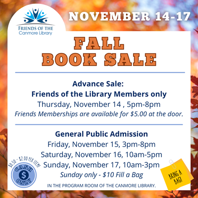 Mark your calendars! The fall book sale will be held November 14th- 17th. The book sale will be open to the general public from Friday November 15th - Sunday November 17th. There will be special early bird access to Friends of the Canmore Library members only on Thursday, November 14th. Friends of the Library memberships can be purchased at the sale for $5, cash only. Book sale hours are as follows: Thursday, November 14 (Friends members only): 5:00 - 8:00pm Friday, November 15: 3:00 - 8:00pm Saturday, November 16: 10:00am - 5:00pm Sunday, November 17: 10:00am - 3:00pm *$10 fill a bag - Sunday only* Please bring your own bag to the sale. Come browse through thousands of hard cover and soft cover books for all ages at incredible prices - all in support of your local library. See you there! Have materials to donate to the sale? Donations of new or gently used books and audiobooks are welcome at the Canmore Library anytime during our operating hours. Thank you!