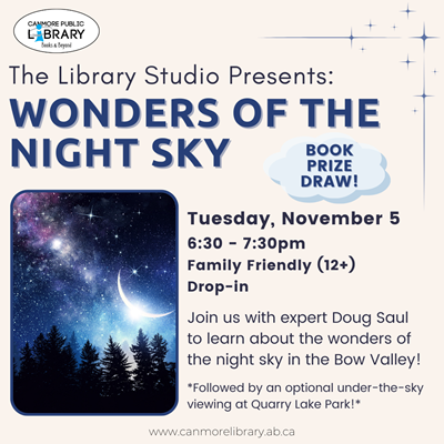 This segment also includes a free gift of red light filter for flashlights and headlamps! Registration is required. Every registered participant will be entered into a draw for a prize of the book "Wonders of the Natural Night"! Join us at the Canmore Public Library for a night among the stars with Doug Saul! This event will take place in the Friends Program Room on Tuesday, November 5th from 6:30 - 7:30pm.