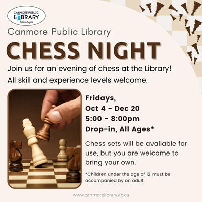 The Canmore Library has teamed up with local chess enthusiast Eric Boerger to bring you Chess Night at the Library! Enjoy a game of chess, connect with other chess players, and maybe even pick up a new trick or two! It doesn't matter if you've played a little or a lot, all skill and experience levels are welcome. There will be chess sets available for use, but depending on the turn out at this drop-in event, you may want to bring your own! This event is open to all ages, but children under the age of 12 must be accompanied by an adult. Chess Night will take place on Friday evenings from 5:00 - 8:00pm from October 4 - December 20 in the Friends Program Room or the CPL Meeting Room.